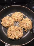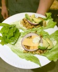 -Cauliflower ‘Burger n’ Fries’ (Makes 4 burgers): 3/4 cup of quinoa (cooked in rice cooker with chicken broth instead of water), 1/2 head of cauliflower (6 florets) (boiled, then roasted with oil, cumin, cayenne pepper, and black pepper), 3/4 cup of panko bread crumbs, 3 eggs, 3/4 cup of mozzarella or cheddar cheese, snap peas boiled and topped with salt as ‘fries’. Toppings: lettuce wraps, jalapeño gouda (2 slices each wrap), 8 slices red onion (2 each lettuce wrap), pesto and Greek yogurt mixture as the mayo, 2 avocados (1/2 per wrap).